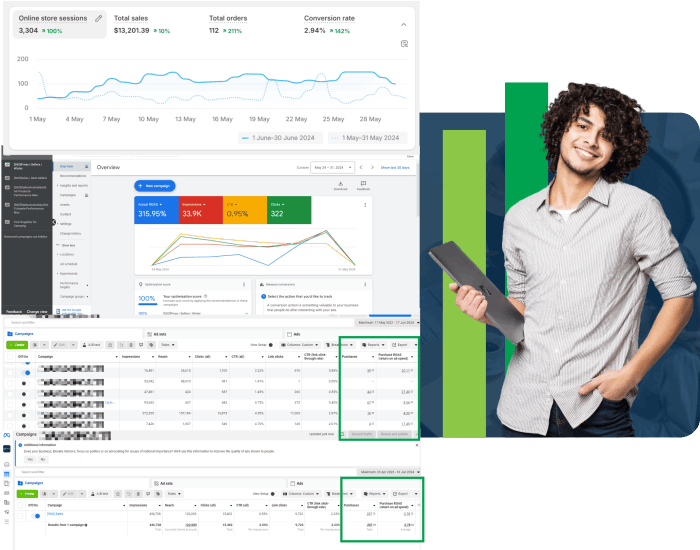 In the first three months, our goal is to help you break even by optimising your website and ad campaigns. You can expect to see improvements in conversion rates, email engagement, and initial sales. Exact results vary depending on your business and market conditions, but our strategies are designed to drive sustainable growth.
